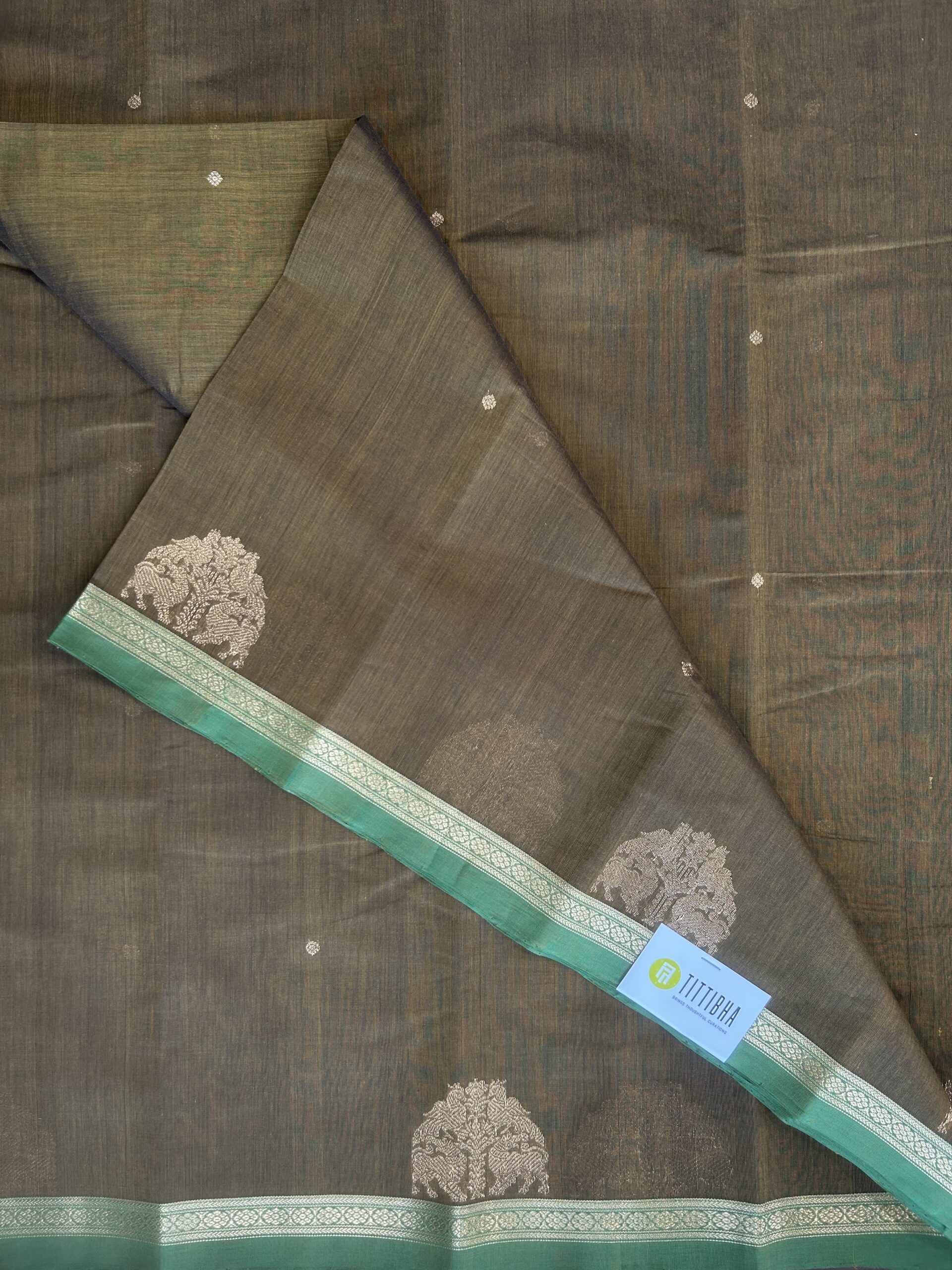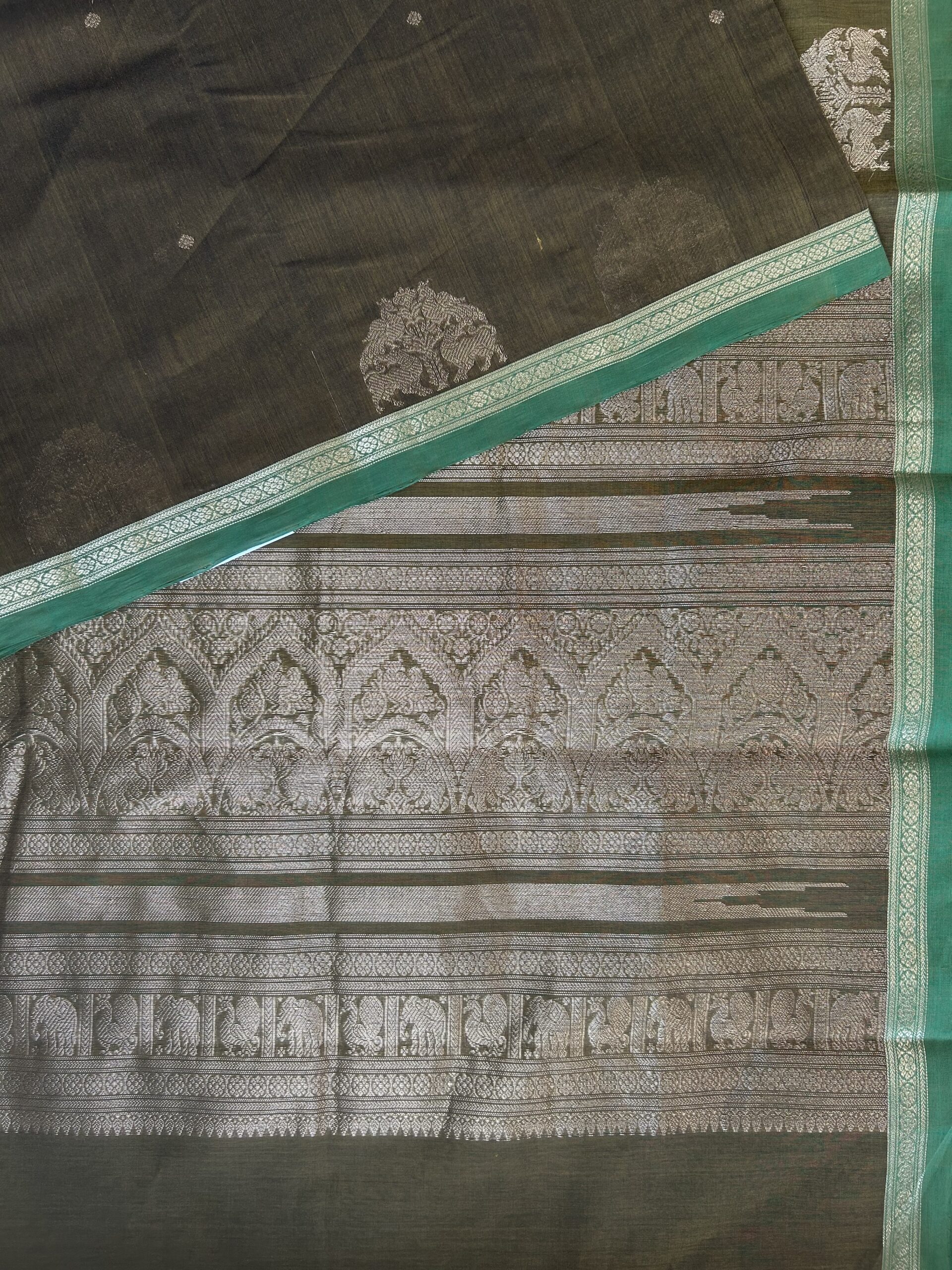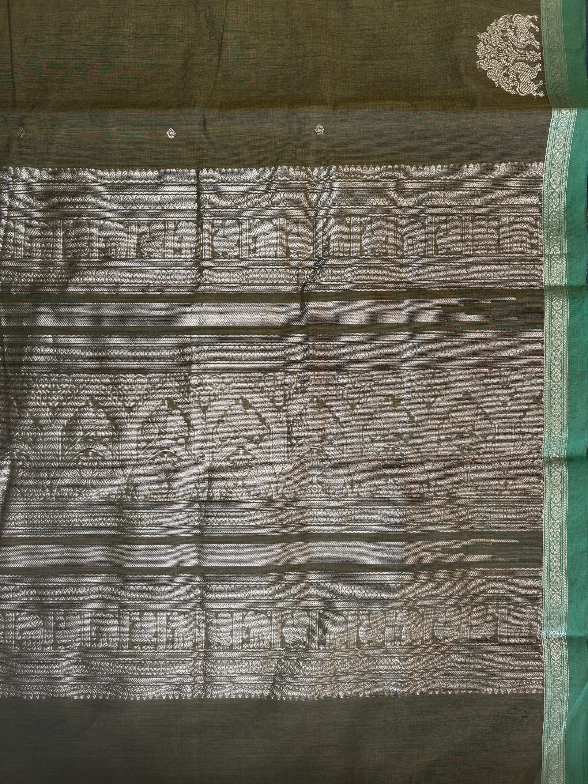 Kavithai I – Our luxe handwoven Kanchi saree in olive green cross black color is minimal, mystical and elegant. The contrasting bottle green chinna border of the saree is adorned with eight petal lotus motifs and iconic kili-yazhi tree motif in gold color zari. The zari woven motifs symbolize love, prosperity and protection. The dainty mayilkan motifs, handwoven in gold color zari, has a mystical allure. Saree pallu with yanai and mayil motifs and the lush foliage narrates a story of nature, elegance and timeless artistry. Saree comes with running blouse piece. It is a sustainable yet luxe drape for special occasions.
