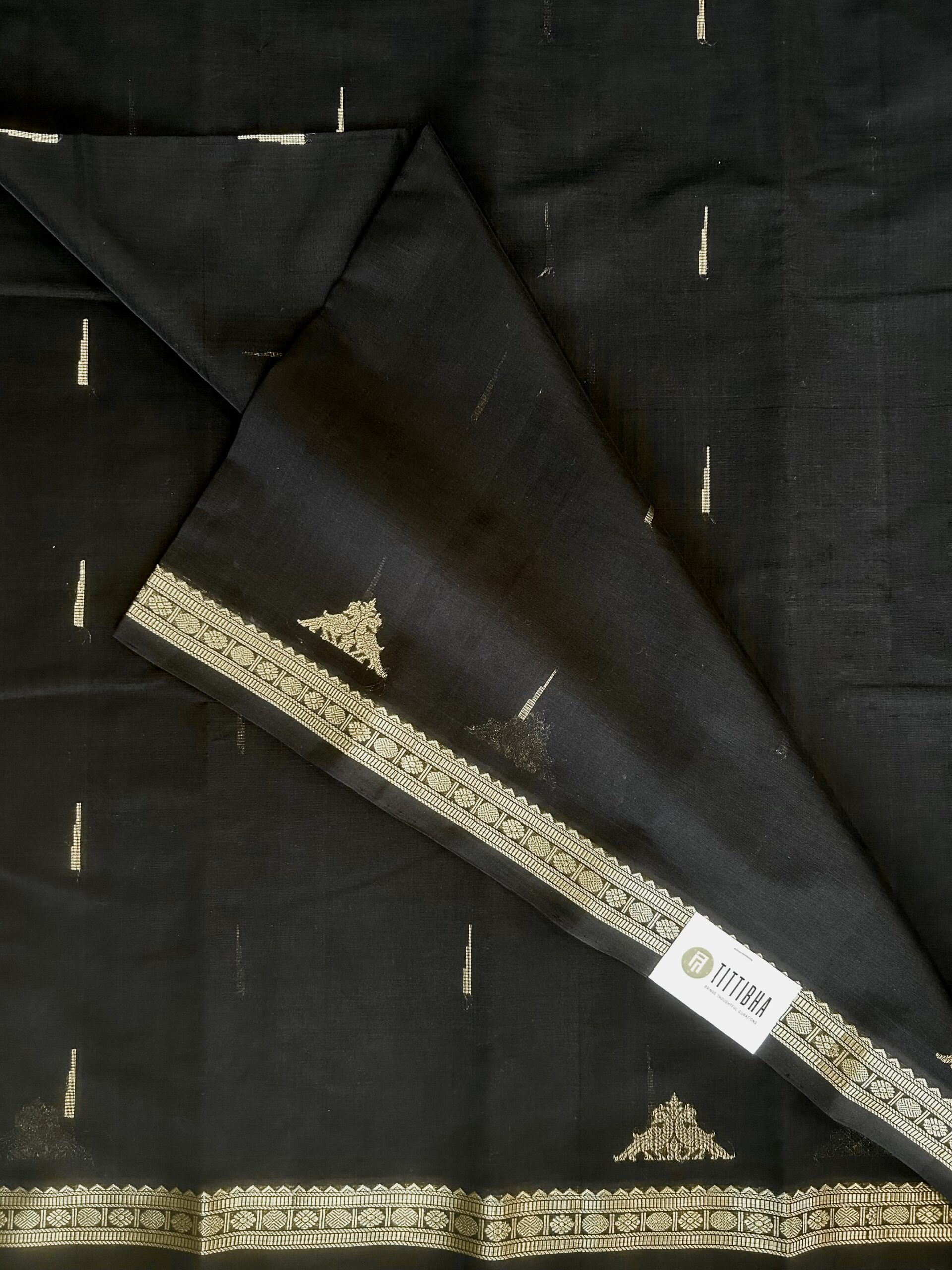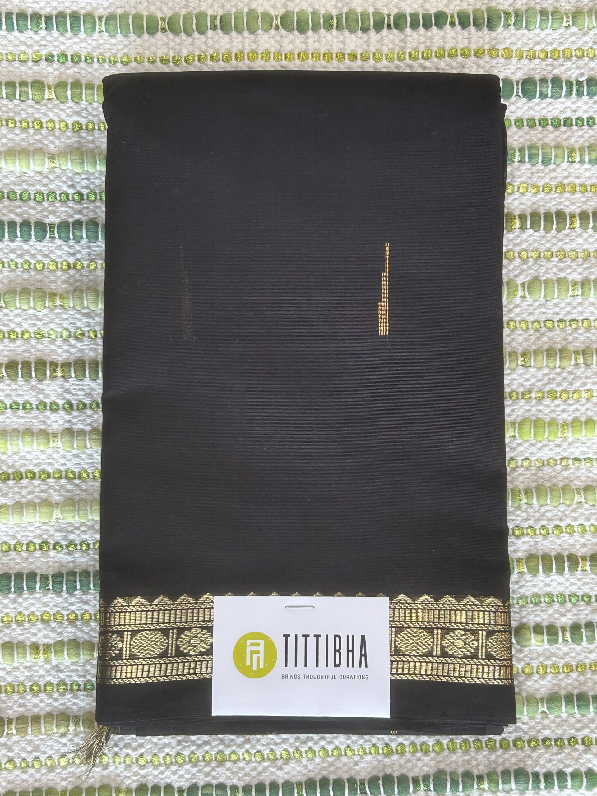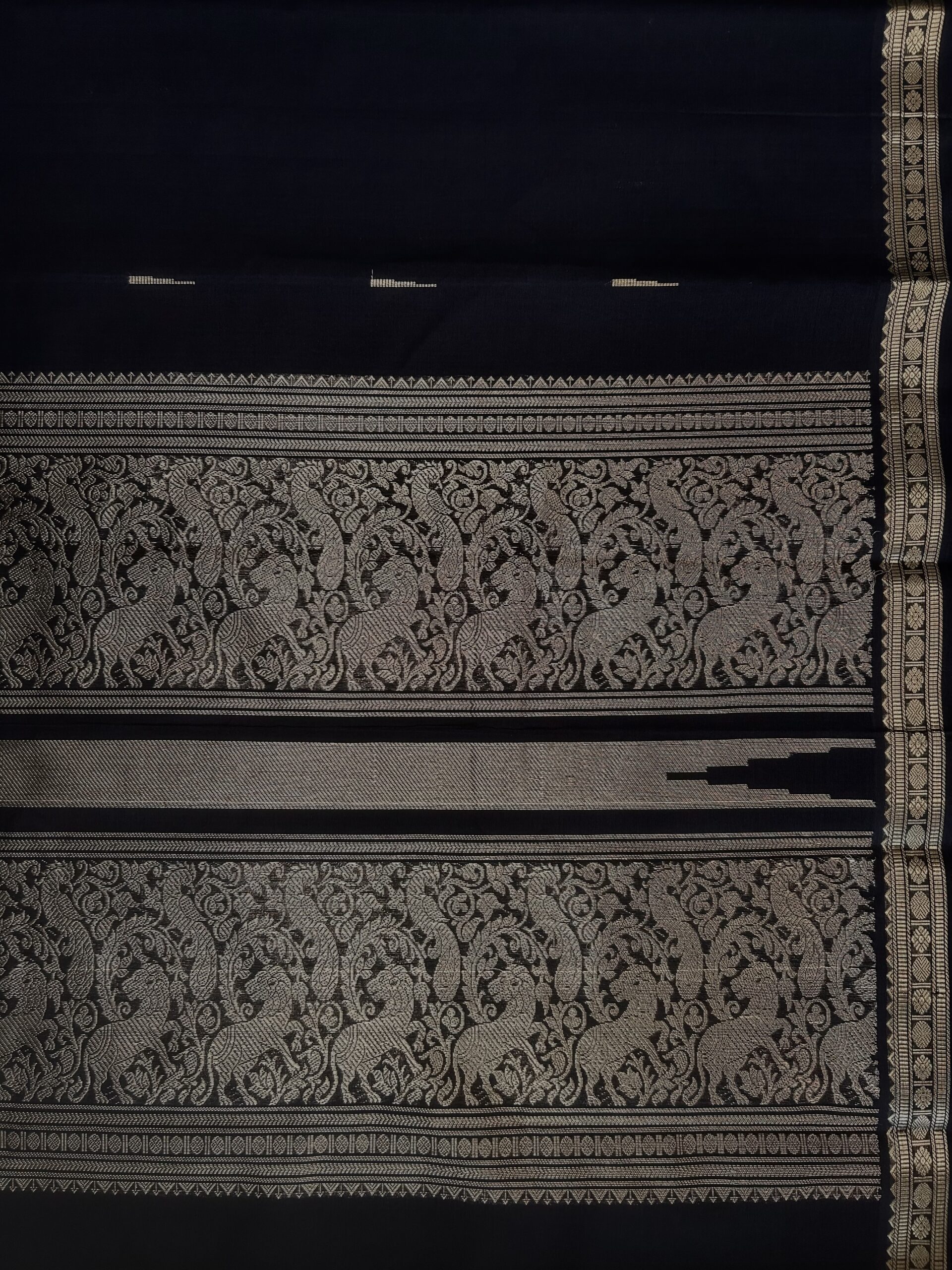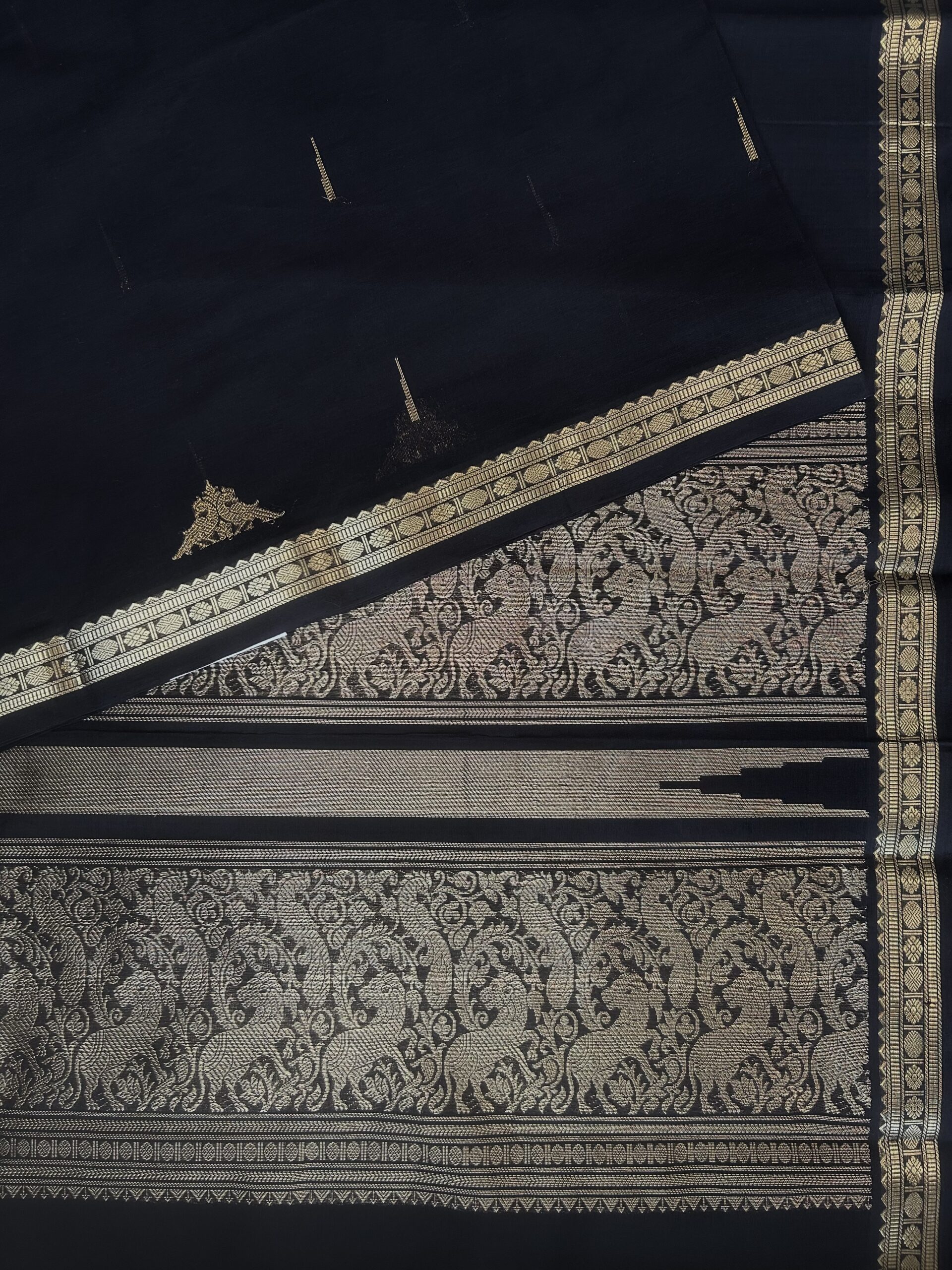 Magizh – Our elegant handwoven Kanchi saree in black color has understated sophistication. The chinna border of the saree has small chakram, rudraksh motifs and mirror image intricate kili motifs. The malligai motifs, handwoven in gold color zari, has a regal appeal. Saree pallu with an ornate zari design features sinham and mayil motifs with the forest backdrop evokes a harmonious blend of nature and tradition. Saree comes with running blouse piece. It is a sustainable yet glamorous drape for moments of celebration.