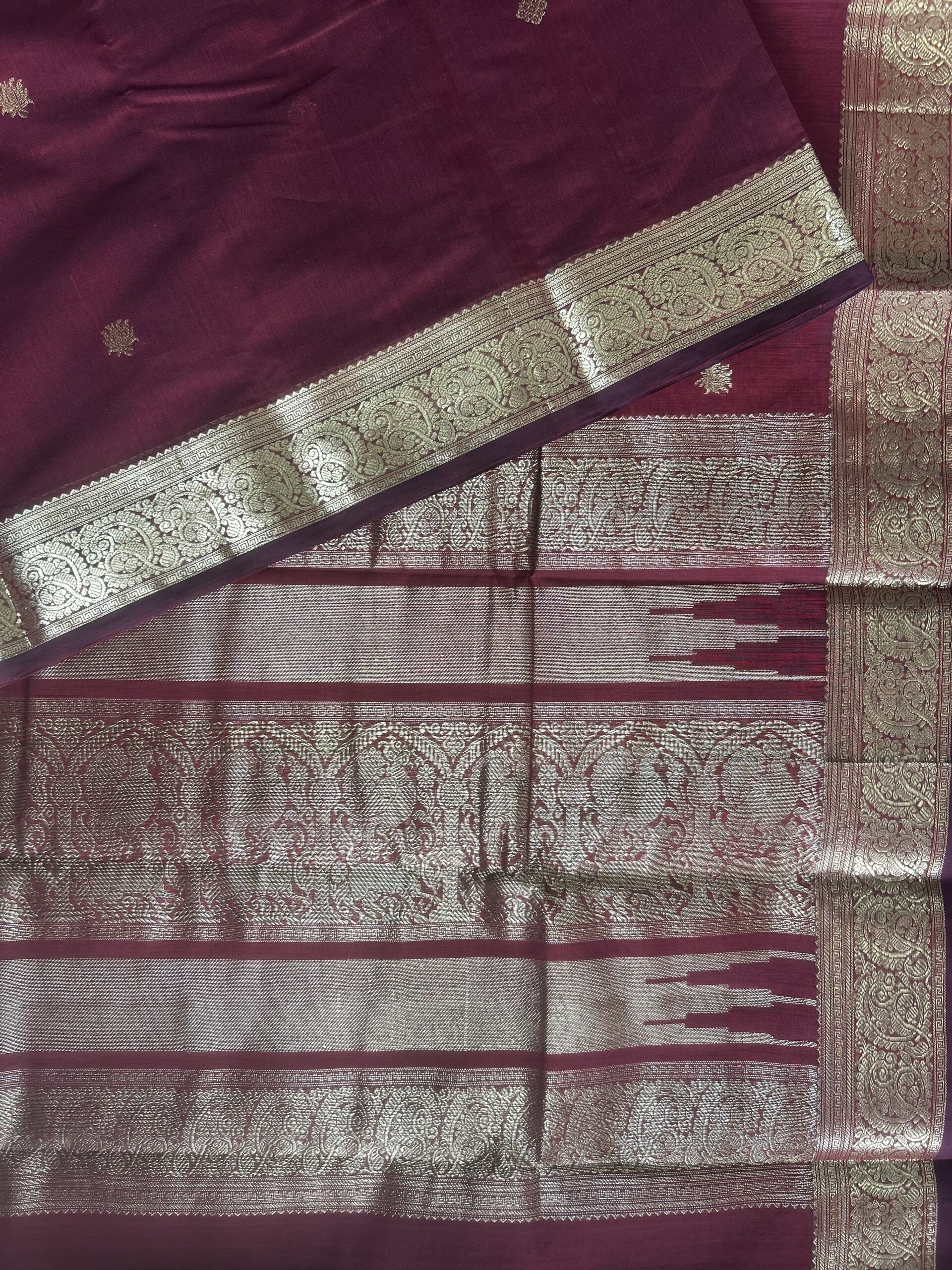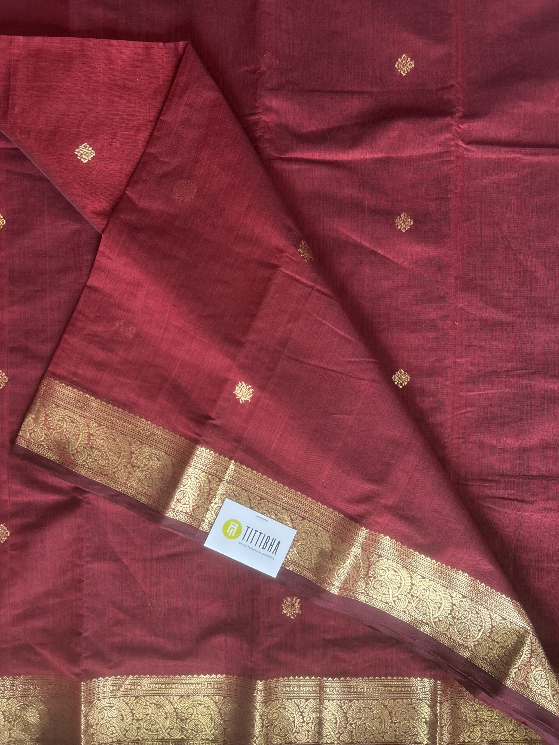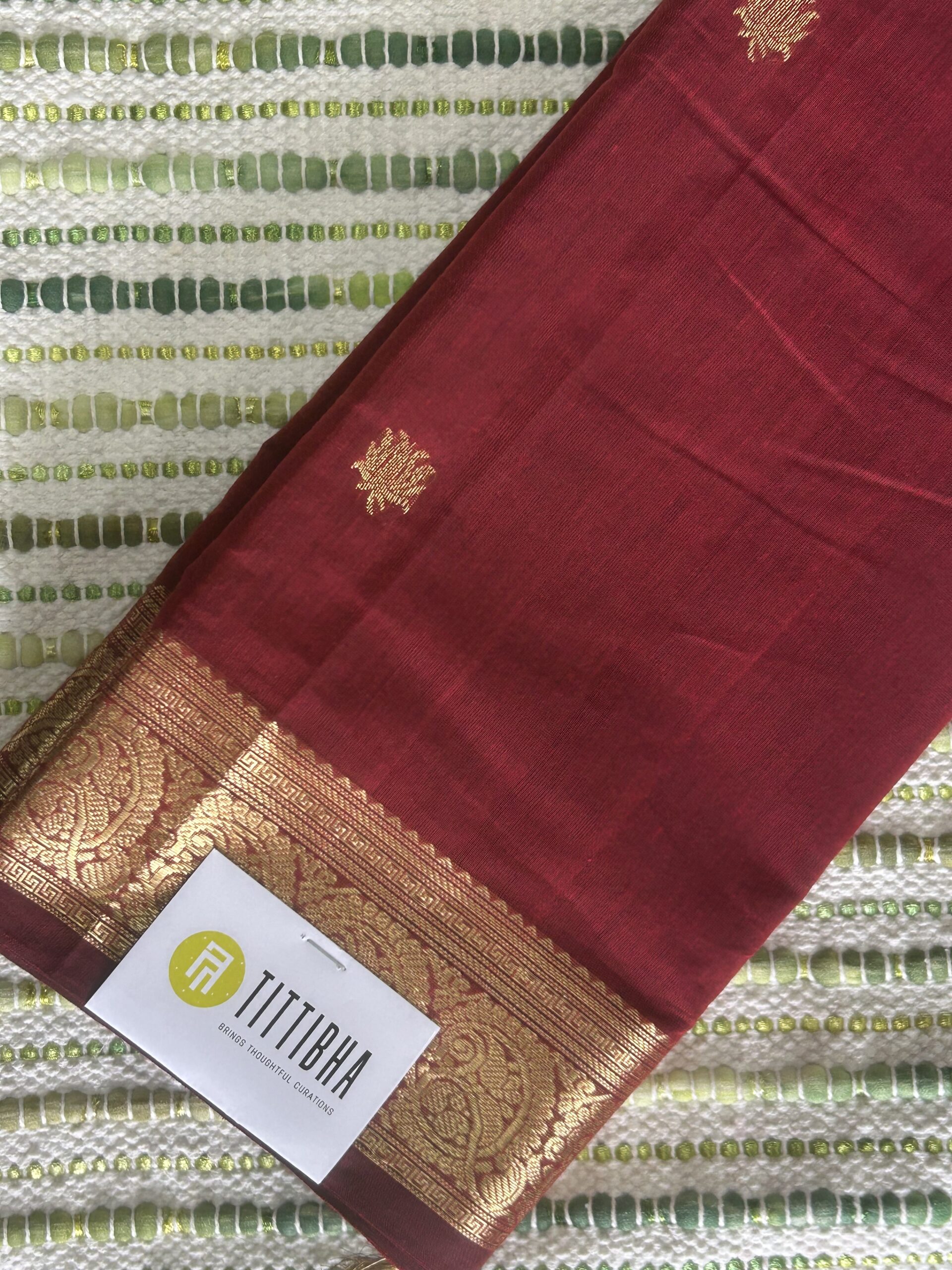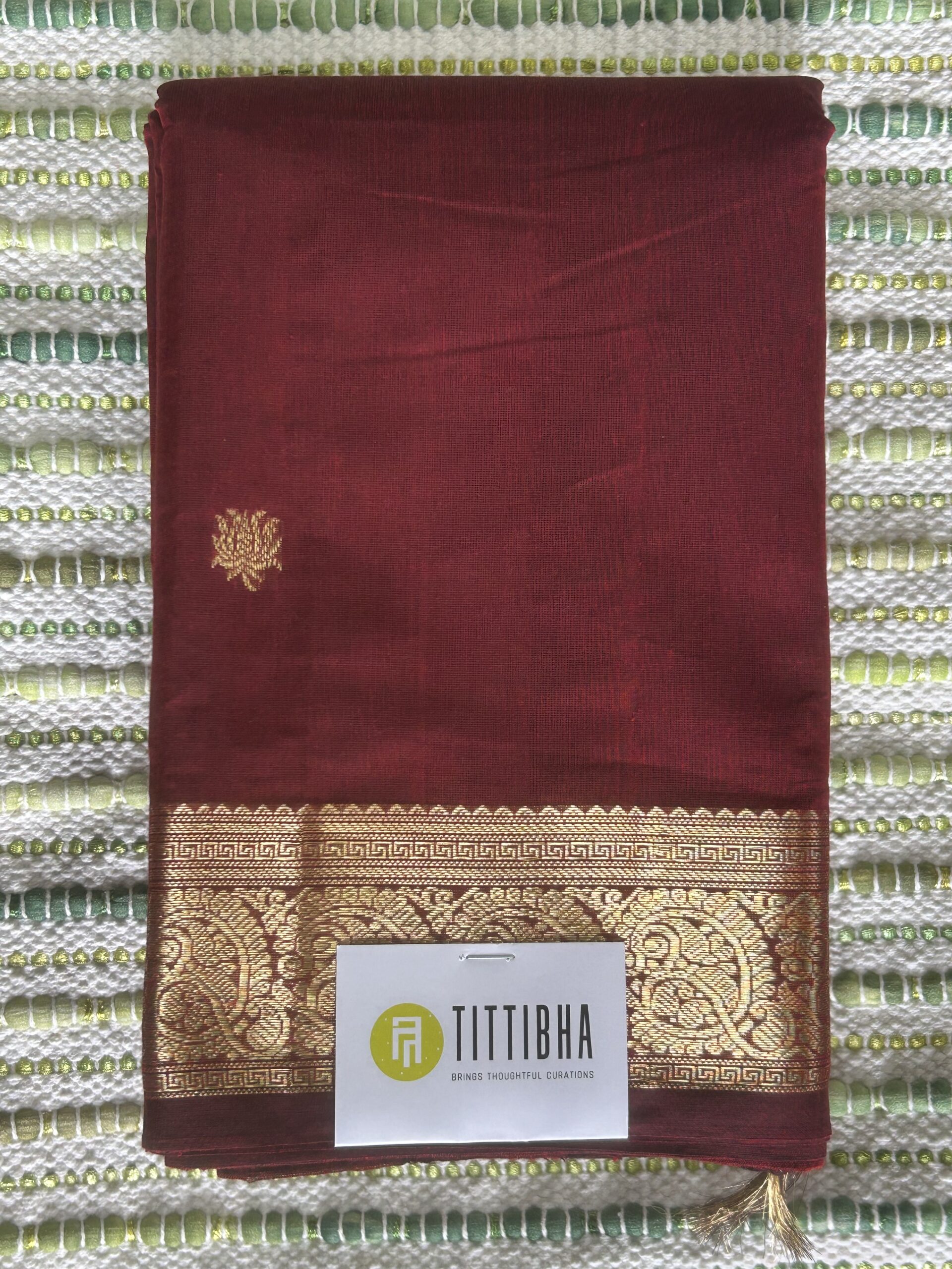 Mazhai – Handwoven Kanchi rich mercerized cotton saree in a maroon cross deep wine dual tone symbolizes joy of renewal. Saree is enriched with intricate gold color zari weaving and the saree body is adorned with all-over kamal and kolam motifs. It has a delicate and celebratory charm and the borders feature intricately woven series of maanga motifs for a regal frame. The ornate zari-woven pallu presents a mystical tableau, with mayil over yazhi motifs set against a traditional mythical backdrop. Enhanced by vazaipoo details that add depth and grace to the saree pallu. Saree comes with a matching running blouse piece, making it a perfect choice for celebrations and special occasions.