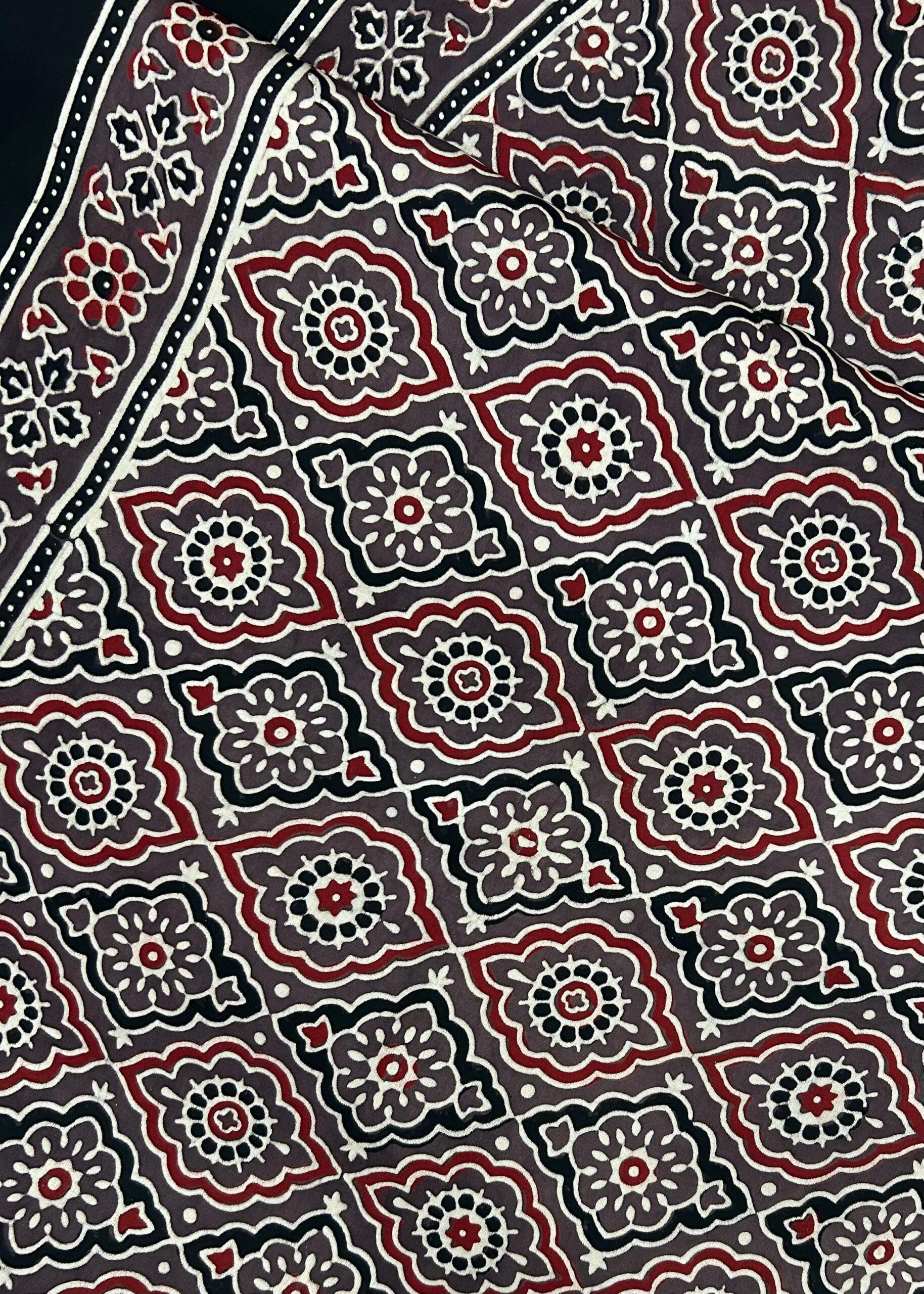 Traditionally, both members of the royal court and the pastoral Maldhari community wore the fabric. At present, print is used by wearers from various walks of life irrespective of genders. Apart from clothing ‘kutch ajrakh’ is extensively used in home linens, accessories, bags, shoes etc. ‘Kutch Ajrakh’ is popular in India as well as globally for its grandeur and exquisite craftsmanship.