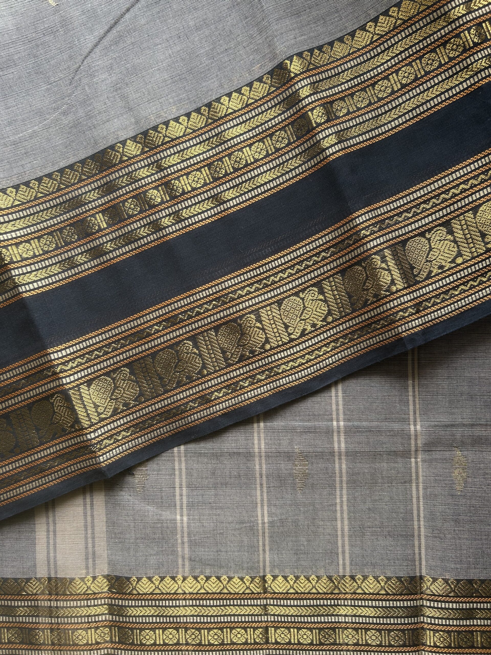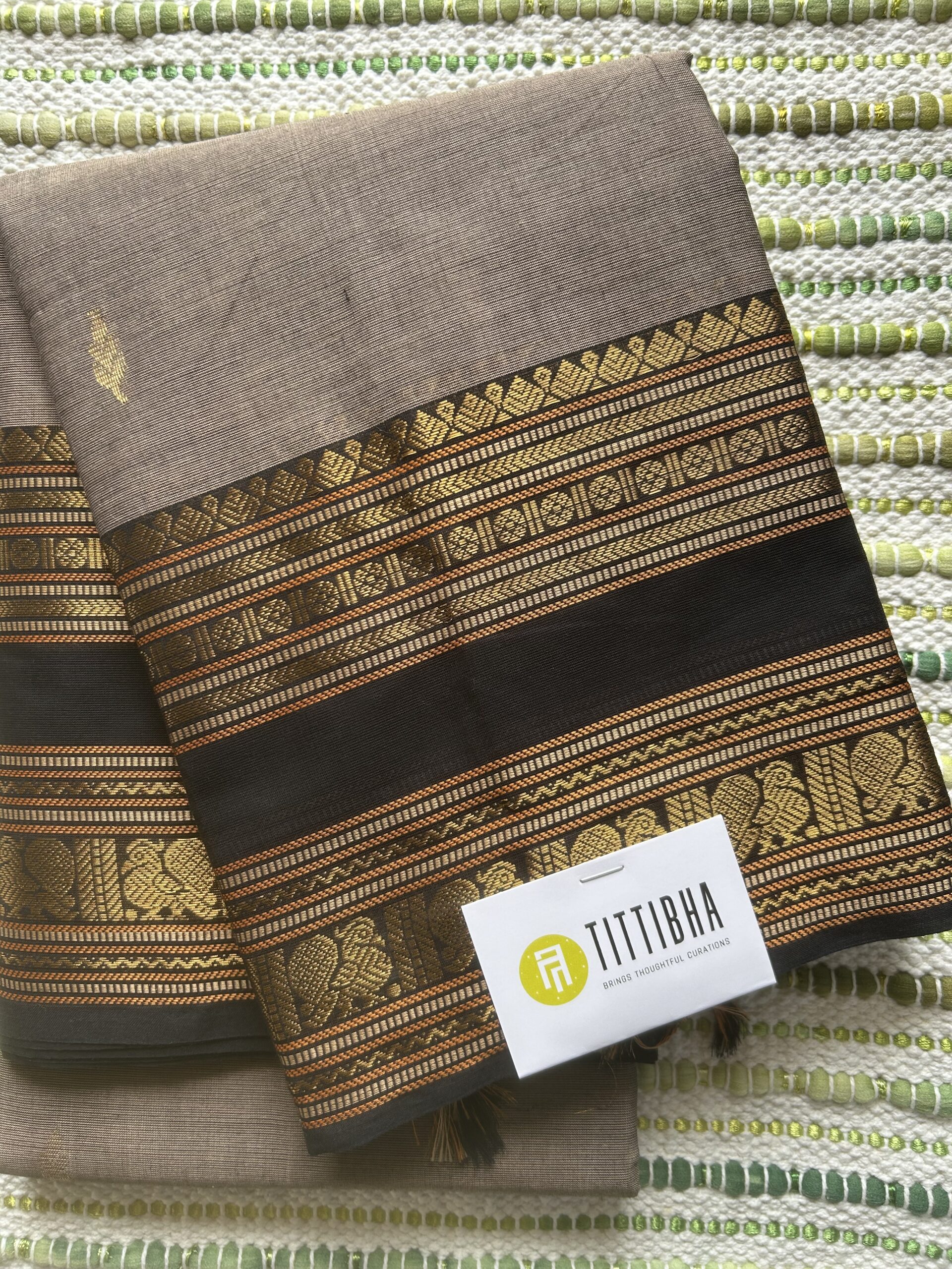 Sani Kizhamai – Our gorgeous Kanchi saree in grey is made in fine 80s count pure cotton. Has Kanchi inspired handwoven periya temple borders consisting of mayil and chakram motifs. Saree has subtle striped pallu. Saree comes with running blouse piece. Apart from aesthetics, saree is high on functionality – it is light in weight, durable, easy to maintain and pocket friendly.